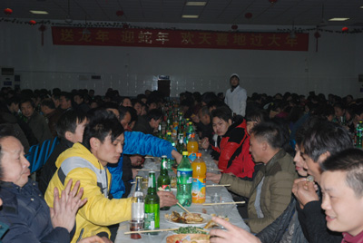 席間,工會主席魯小林、副主席高文生奔波兩地,向每一位員工表達了新春的問候和祝福,并囑咐大家一定要多打電話給家鄉(xiāng)的親人表示祝福和問候,同時,對員工們?yōu)闁|華的發(fā)展付出的辛勤勞動表達了感激之情。廣大員工在同吃年夜飯,同喝喜慶酒,同吃餃子、同慶佳節(jié)之際,也促進了彼此的交流、增強了彼此的感情。整個年夜飯活動始終處在一派熱鬧、祥和的氛圍之中。