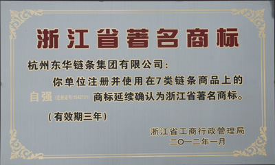 日前,東華集團注冊并使用在7類鏈條商品上的“自強”(注冊證號:1542721)商標被浙江省工商行政管理局延續確認為浙江省著名商標,有效期三年?!白詮姟鄙虡藶闁|華集團鏈條的三大品牌之一,在國內外鏈條行業享有較高知名度。