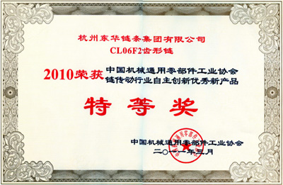 會(huì)上,中國機(jī)械通用零部件工業(yè)協(xié)會(huì)對2010年自主創(chuàng)新先進(jìn)企業(yè)及自主創(chuàng)新優(yōu)秀新產(chǎn)品進(jìn)行表彰。東華集團(tuán)被授予“2009~2010年度自主創(chuàng)新先進(jìn)企業(yè)”榮譽(yù)稱號(hào);東華集團(tuán)生產(chǎn)的“PT100SLR免維護(hù)梯級(jí)鏈”和“CL06F2齒形鏈”榮獲中國機(jī)械通用零部件工業(yè)協(xié)會(huì)鏈傳動(dòng)行業(yè)自主創(chuàng)新優(yōu)秀新產(chǎn)品特等獎(jiǎng);另有5個(gè)新產(chǎn)品榮獲自主創(chuàng)新優(yōu)秀新產(chǎn)品優(yōu)秀獎(jiǎng)。董事長助理、黨委書記張世強(qiáng)上臺(tái)領(lǐng)獎(jiǎng)。