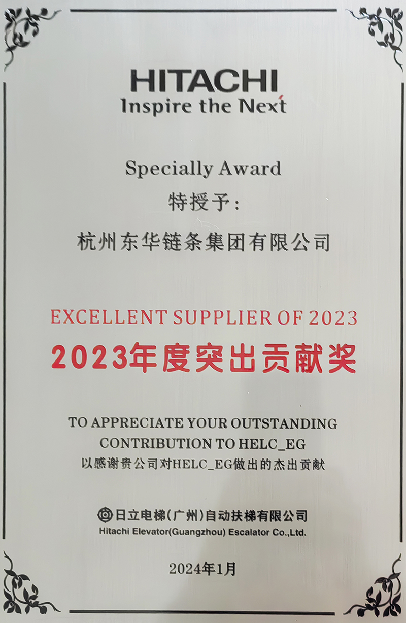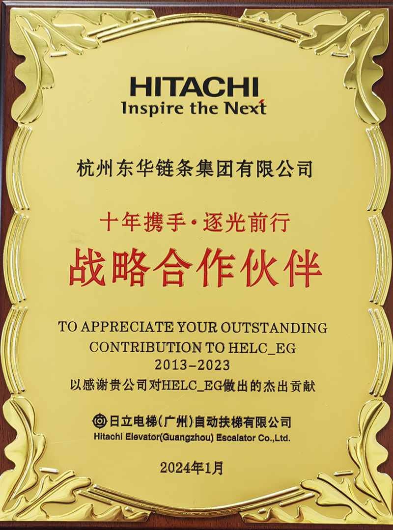 日立電梯(廣州)自動扶梯有限公司是東華的重點配套主機客戶,其配套產品涵蓋商用梯、公交梯,雙方在多年的合作中已建立了良好的合作基礎。2023年,扶梯工程鏈事業部積極實施細分市場冠軍戰略,堅持專業化、系統化、高端化和高質量發展的定位,不斷開發和滿足日立電梯的需求,積極走訪市場,在產品制造過程中嚴控工藝、提升交付率,在產品質量上更是精益求精,全方位提升服務。此次東華獲得2023年度突出貢獻獎和戰略合作伙伴獎是日立電梯(廣州)自動扶梯有限公司對東華扶梯鏈產品質量的高度肯定,也讓我們對2024年服務好客戶信心倍增。