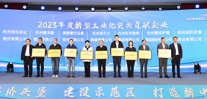 會上,東華鏈條獲得“2023年度新型工業(yè)化突出貢獻(xiàn)企業(yè)”、“2023年度數(shù)實(shí)融合示范企業(yè)”稱號。集團(tuán)董事長宣成參加會議并上臺(右五)領(lǐng)獎。