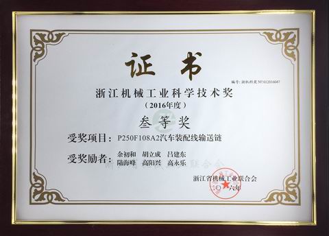 日前,在浙江省機(jī)械工業(yè)聯(lián)合會(huì)四屆四次理事(擴(kuò)大)會(huì)議上傳來喜訊,東華鏈條集團(tuán)所屬杭州自強(qiáng)鏈傳動(dòng)有限公司開發(fā)的“P250F108A2汽車裝配線輸送鏈”被授予“2016年度浙江機(jī)械工業(yè)科學(xué)技術(shù)三等獎(jiǎng)”,這是東華集團(tuán)產(chǎn)品創(chuàng)新項(xiàng)目連續(xù)五年榮獲浙江機(jī)械科技獎(jiǎng),也是全省機(jī)械領(lǐng)域2016年度51項(xiàng)科技創(chuàng)新成果獎(jiǎng)項(xiàng)中僅有的一項(xiàng)鏈傳動(dòng)產(chǎn)品創(chuàng)新項(xiàng)目。