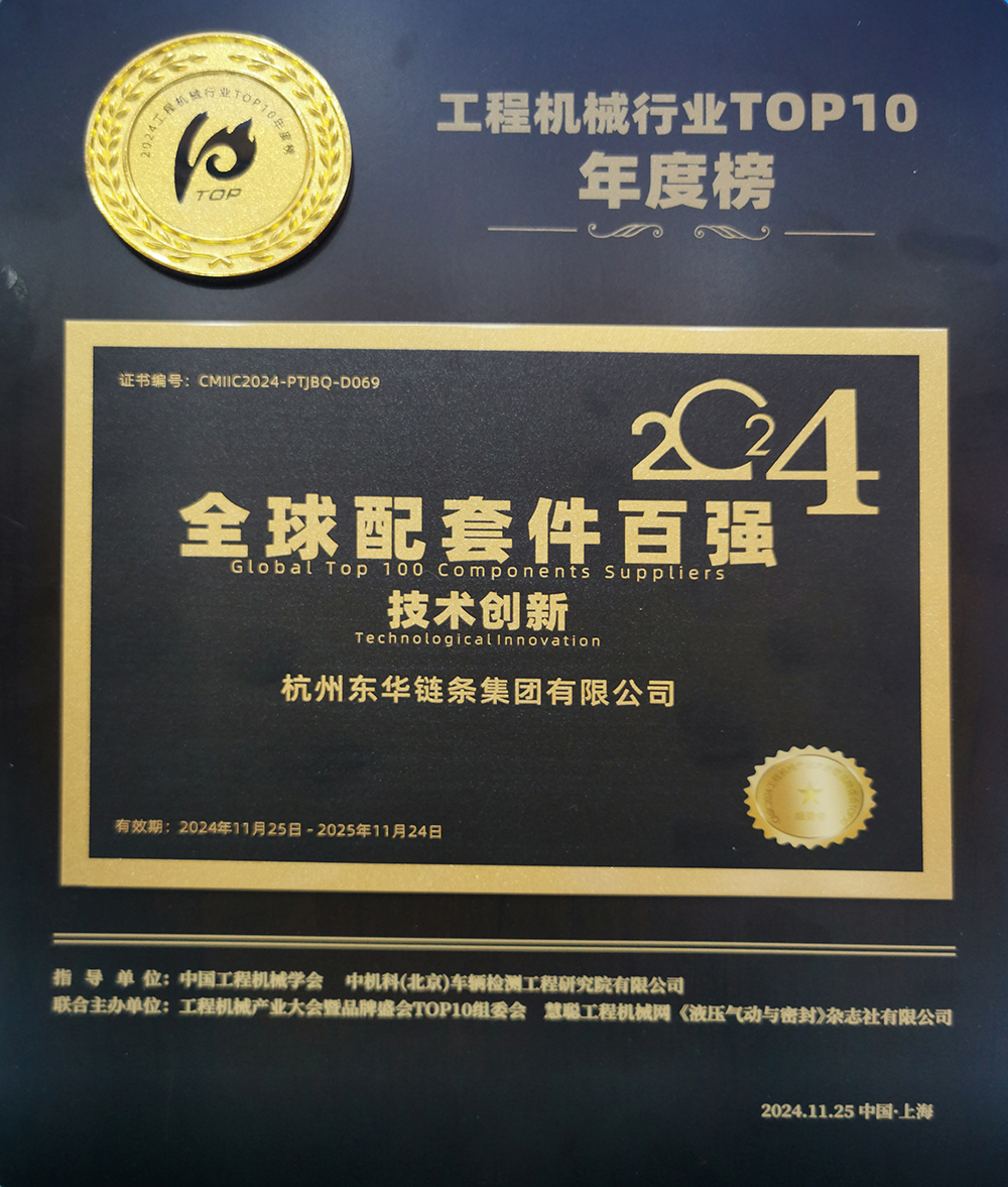 會上,東華獲評“2024工程機械行業TOP10全球配套件百強技術創新”獎。東華鏈條集團副總經理楊小勇代表企業參加會議并上臺領獎。