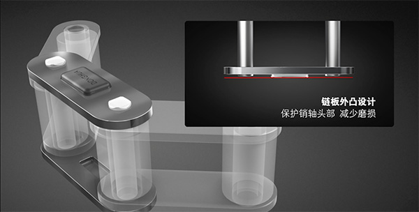 1)鏈板外凸設(shè)計(jì),保護(hù)銷(xiāo)軸頭部,減少磨損;2)銷(xiāo)軸表面硬化處理,提高使用壽命。